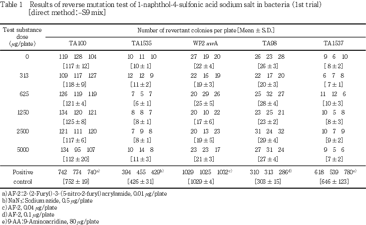 以上の成績から,1-ナフトール-4-スルホン酸ナトリウムの細菌に対する遺伝子突然変異誘発性は陰性と判定した.