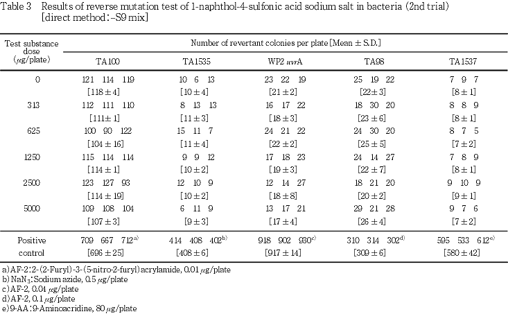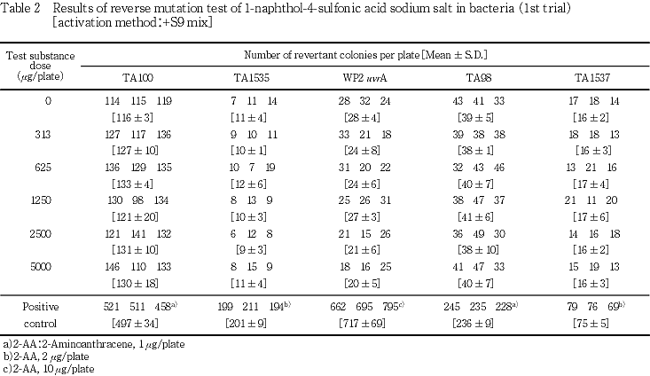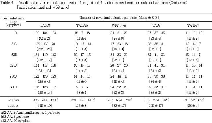 以上の成績から,本実験条件下では,1-ナフトール-4-スルホン酸ナトリウムの遺伝子突然変異誘発性は陰性と判定した.