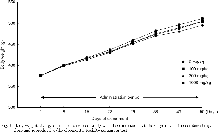 投与液の濃度確認のため,調製開始時に調製した全ての試験群の投与液から無作為にサンプルを抽出し投与液中の被験物質濃度の分析を実施した.その結果,投与液は表示濃度に対し91.9〜98.3 %の範囲で調整されており,ほぼ所定量のコハク酸二ナトリウム六水和物が含有されていることを確認した.