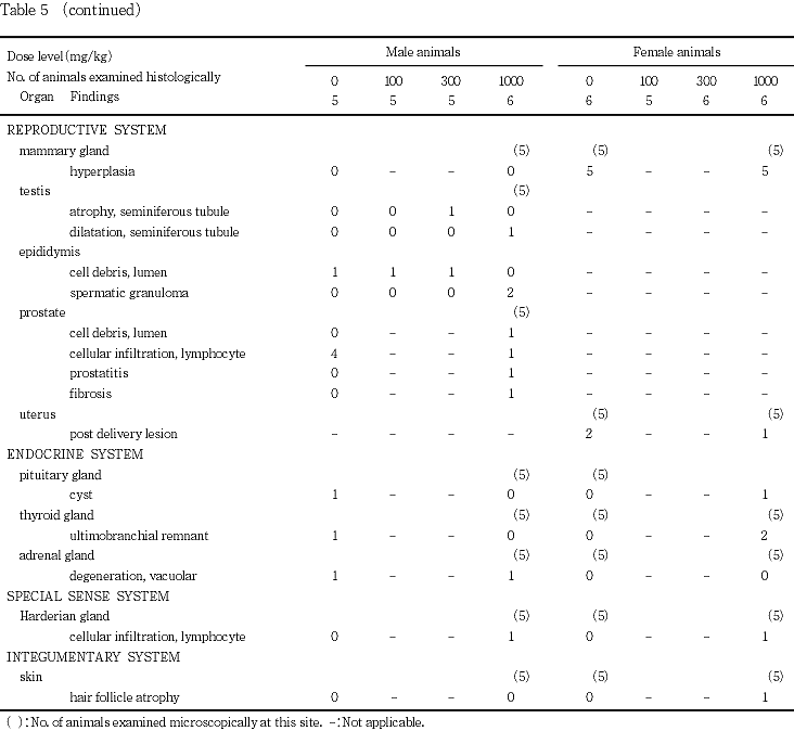 雌では,脾臓の癒着が対照群で単発性に,腺胃の黒色斑点が300および1000 mg/kg群でそれぞれ2および1例に,肝臓の白色斑点が300 mg/kg群で単発性に,肝臓の黄色斑点,下垂体の嚢胞および脱毛が1000 mg/kg群でそれぞれ単発性に観察された.