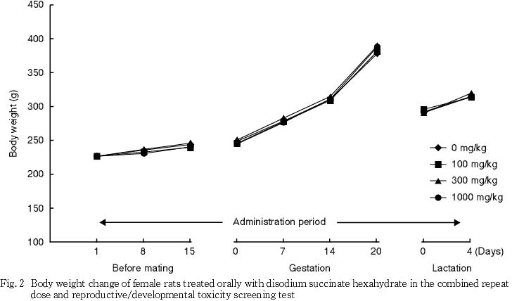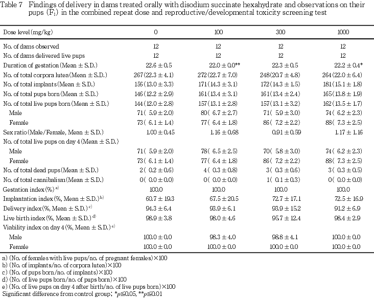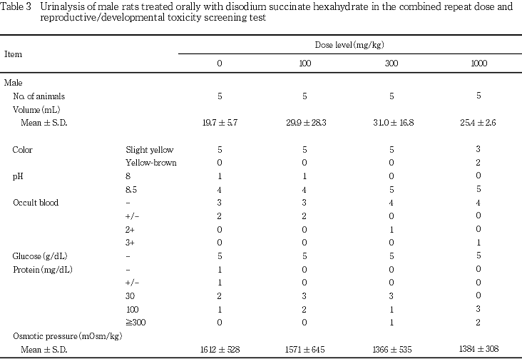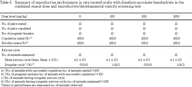 以上のことから,コハク酸二ナトリウム六水和物の反復投与により投与後の一般状態の変化として,雄の1000 mg/kg群で軟便が観察された.また,雌では尿素窒素が1000 mg/kg群で高値を示し,雄の尿検査で300および1000 mg/kg群において300 mg/dL以上の蛋白を示す動物が少数例ながら認められ,被験物質投与による腎臓への影響が示唆された.したがって,親動物に対する無影響量は雄で100 mg/kg/day,雌で300 mg/kg/dayと判断された.