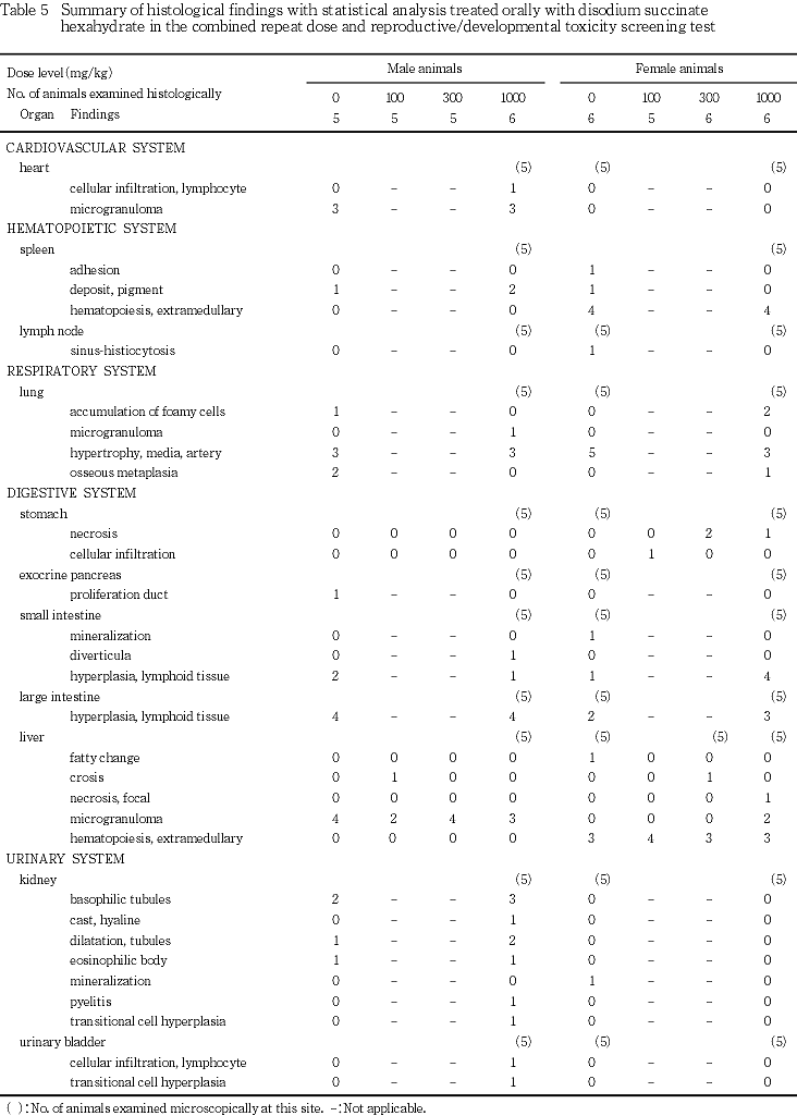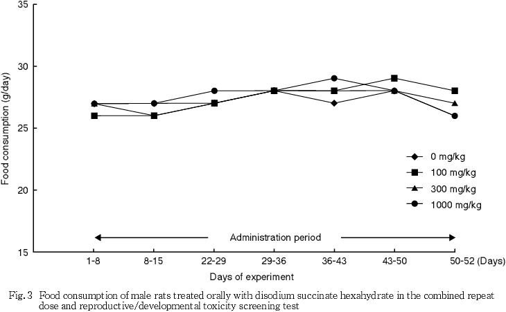 以上の結果から,本試験条件下ではコハク酸二ナトリウム六水和物の反復投与により投与後の一般状態の変化として雄の1000 mg/kg群で軟便が観察された.また,雌では尿素窒素が1000 mg/kg群で高値を示し,雄の尿検査で300および1000 mg/kg群において300 mg/dL以上の蛋白を示す動物が少数例ながら認められた.したがって,無影響量は雄で100 mg/kg/day,雌で300 mg/kg/dayと判断された.雌雄の生殖能および児動物の発生・発育に及ぼす影響はともに1000 mg/kg投与でも認められず,いずれも無影響量は1000 mg/kg/dayと判断された.