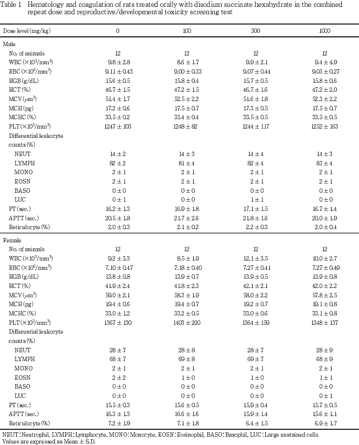 体重,摂餌量,血液学検査および血液凝固能検査には被験物質投与の影響は認められなかった.血液生化学検査では,ナトリウムが雄の300および1000 mg/kg群で高値を示したが,被験物質がナトリウムを含んでおり,容易にイオン化することから被験物質由来の可能性が示唆され,変化も軽微なことから影響とは考えられなかった.一方,雌の1000 mg/kg群では尿素窒素が高値を示した.尿検査では雄の300および1000 mg/kg群で300 mg/dL以上の蛋白を示す動物が少数例ながら認められ,被験物質投与による腎臓への影響が示唆された.しかし,雌雄の1000 mg/kg群において被験物質投与の影響を示唆する腎臓の組織学的変化は認められなかったことから毒性的意義は低いものと判断された.また,雄の尿検査において潜血を示す動物が300および1000 mg/kg群で認められたが,いずれも1例のみの変化であり,色調の変化や蛋白高値との関連も乏しく被験物質投与との関連は明らかではなかった.尿量が異常高値を示した動物が100および300 mg/kg群で各1例に認められたが,原因は不明であった.しかし,1000 mg/kg群では同様の動物が認められず,いずれも単発性の変化であることから,被験物質投与の影響との関連はないものと考えられた.