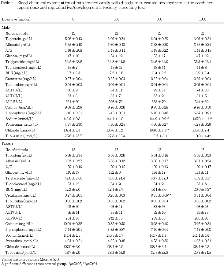 雌では,300 mg/kg群でクレアチニンが高値を示したが,用量には対応しない変化であった.1000 mg/kg群で尿素窒素が高値を示した.