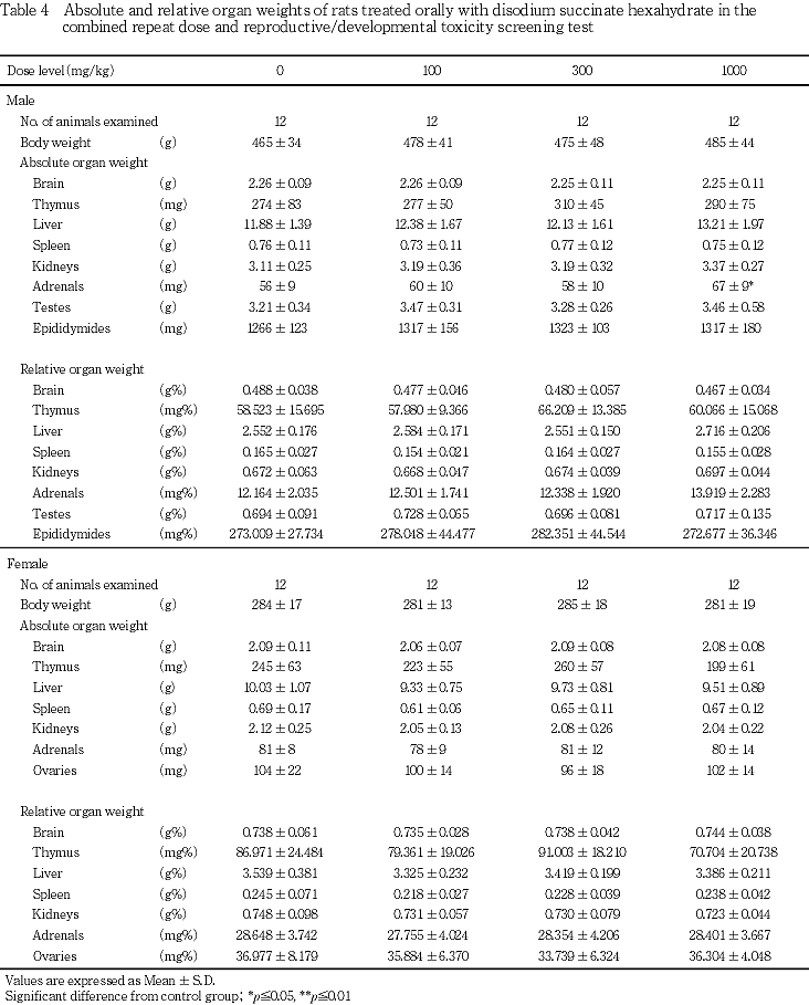 器官重量では副腎の絶対重量が雄の1000 mg/kg群で高値を示したが,相対重量には有意な変化はみられず,個体で特に高値を示した動物の副腎に組織学的変化が認められなかったことから被験物質投与の影響とは判断しなかった.