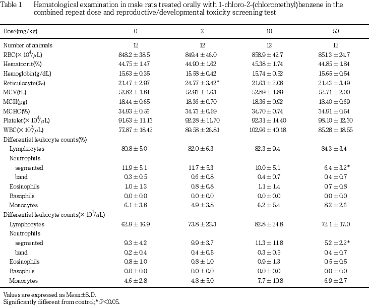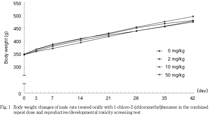 1-クロロ-2-(クロロメチル)ベンゼンは染料,顔料,医薬および農薬を製造する際の中間体として用いられる化学物質である1).毒性情報としては,ラットの経口投与によるLD50値が雄で951 mg/kg,雌で783 mg/kg2),皮膚や粘膜に対し刺激性を有する3)との報告がある.今回,OECDによる既存化学物質の安全性点検に係わる毒性調査事業の一環として,SDラット(1群雌雄各12匹)に2,10および50 mg/kgの用量を交配前14日から交配を経て雄は計45日間,雌は妊娠,分娩を経て哺育3日まで経口投与し,反復投与毒性および生殖発生毒性について検討した.