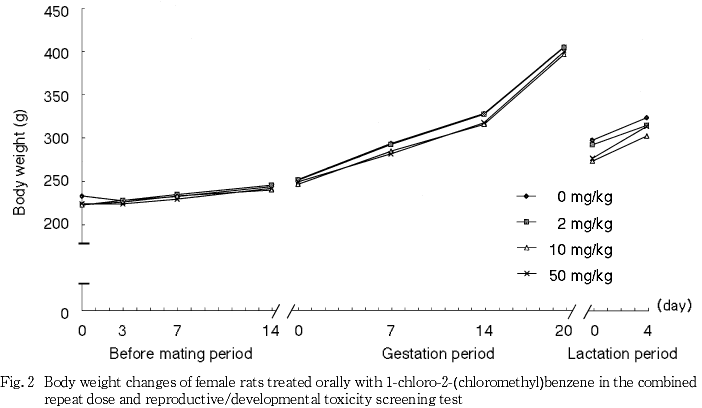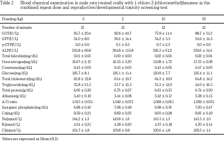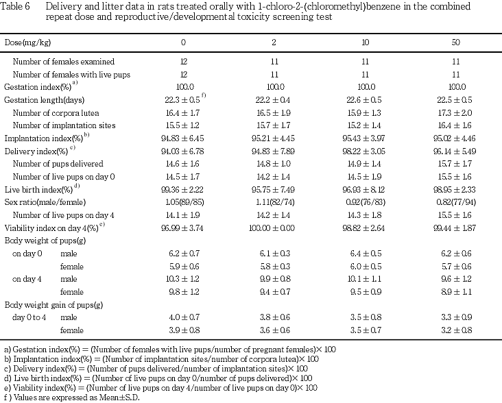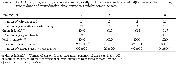 以上の結果から,1-クロロ-2-(クロロメチル)ベンゼンの反復投与毒性に関する無影響量は雄が2 mg/kg/day,雌が10 mg/kg/day,生殖発生毒性に関する無影響量は親動物および児動物とも50 mg/kg/dayと考えられた.