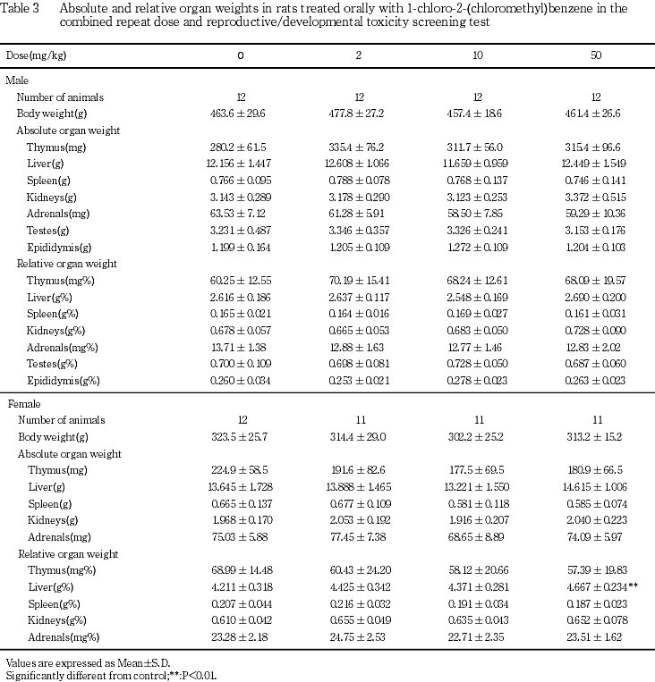 50 mg/kg群の雌で肝臓の相対重量が対照群と比べ有意な増加を示し,絶対重量では増加傾向が認められた.雄では,いずれの器官においても絶対重量および相対重量とも,対照群と被験物質投与群との間に有意な差は認められなかった.2および10 mg/kg群の雌雄では対照群と被験物質投与群との間に有意な差は認められなかった.