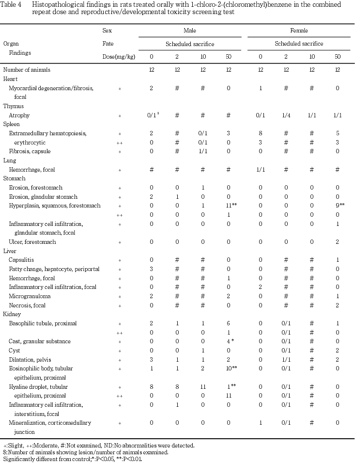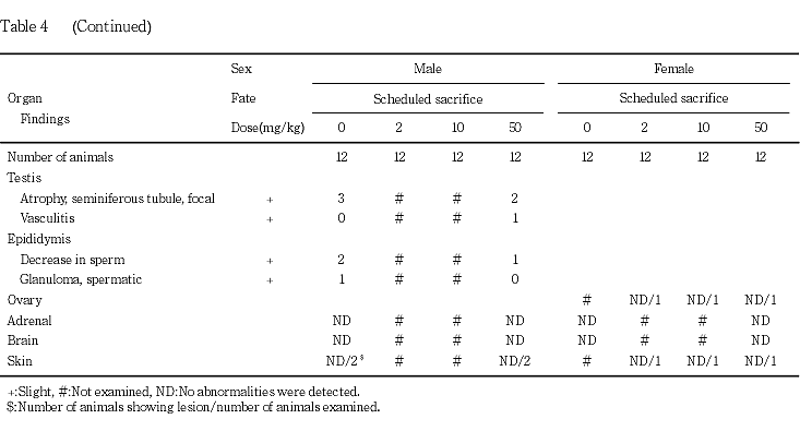 病理組織学検査は雌雄の対照群および50 mg/kg群の脳,胃,心臓,肝臓,腎臓,脾臓,副腎,精巣,精巣上体ならびに全動物の肉眼的異常部位について,常法に従いヘマトキシリン・エオジン染色標本を作製して鏡検した.その結果,雌雄の胃および雄の腎臓で被験物質に起因する変化が認められたので,2および10 mg/kg群のこれらの器官についても検査した.