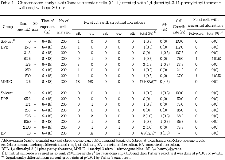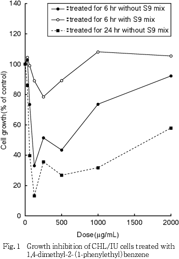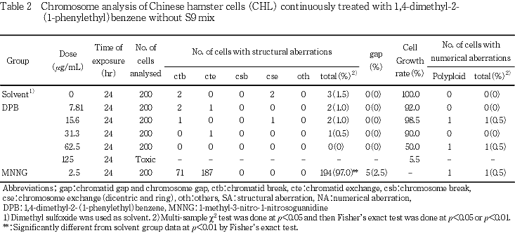 以上の成績から,1,4-ジメチル-2-(1-フェニルエチル)ベンゼンのCHL/IU細胞に対する染色体異常誘発性は陰性と判定した.