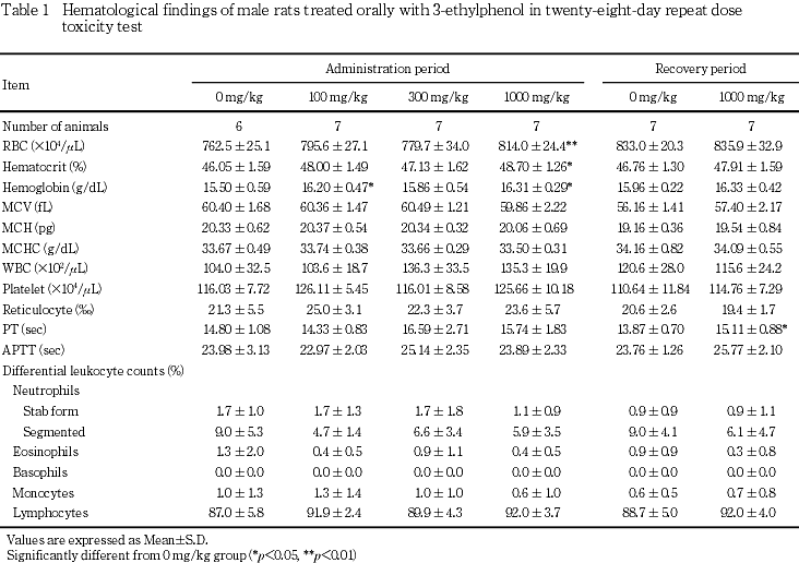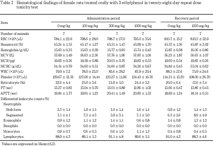 一般状態では,1000 mg/kg投与群の雌雄で投与期間中に横臥あるいは腹臥,よろめき歩行および外尿道口周囲の被毛の汚れが散見されたが,回復期間中には認められなかった.この症状は急性経口投与毒性試験 1)でも観察されたことから3-エチルフェノール投与により発現した急性症状と考えられた.