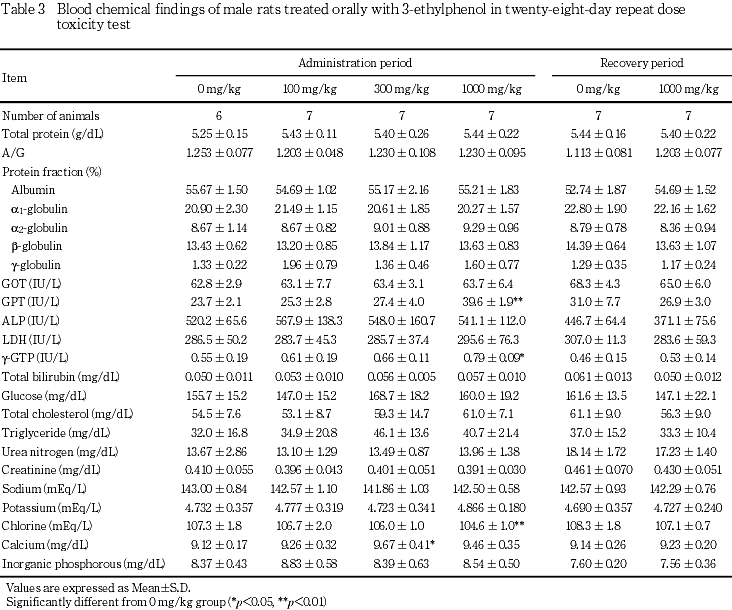 血液生化学検査では,投与期間終了時に1000 mg/kg投与群で雌雄ともにGPTの増加および雌に総コレステロールの増加が認められた.この変化は用量設定試験でも認められ,3-エチルフェノール投与に起因する変化と考えられた.GPTおよび総コレステロールの増加は3-アミノフェノールおよび4-エチルフェノールの28日間反復経口投与毒性試験の高用量群でも認められていることから,これらのフェノール類に共通の変化と考えられた.しかし回復期間終了時には認められないことから,可逆性の変化と考えられた.
