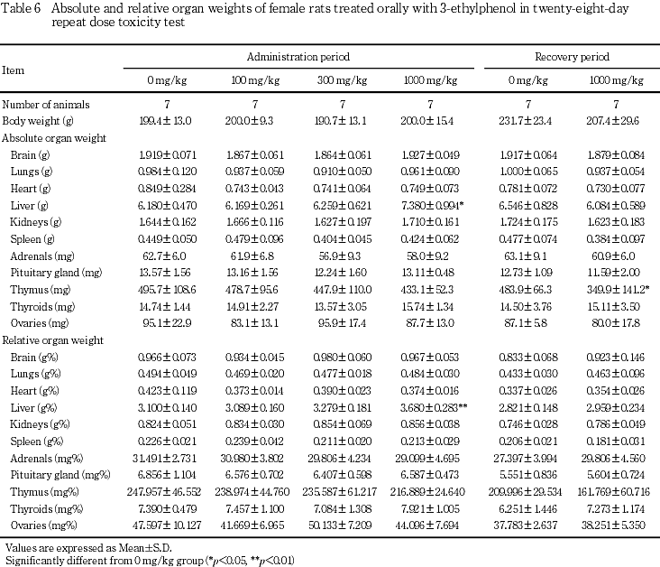 器官重量では,1000 mg/kg投与群で雌雄に肝臓の絶対重量あるいは相対重量の高値が認められ,また雄では腎臓の相対重量の高値も認められ,3-エチルフェノール投与に起因する変化と考えられた.