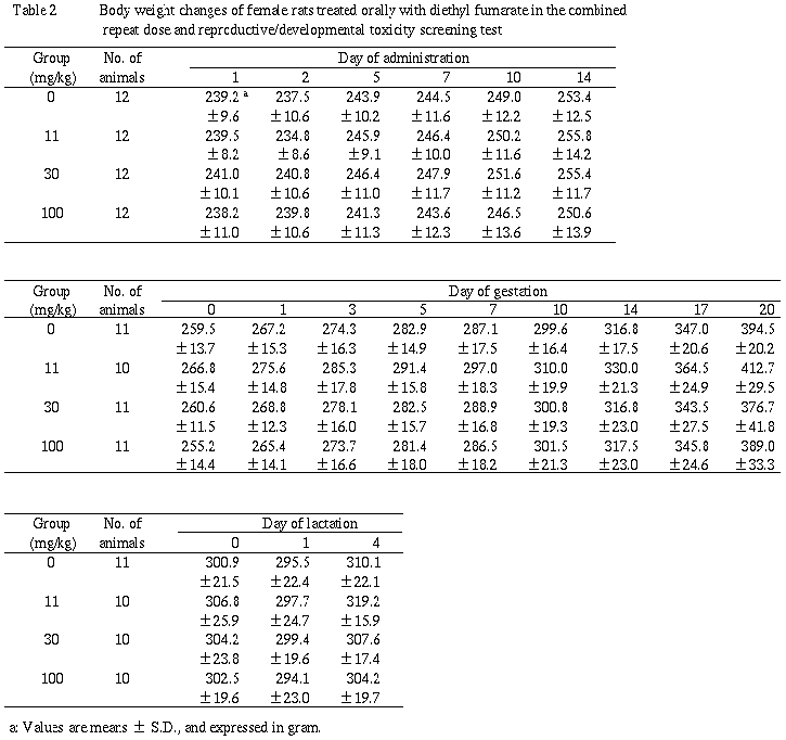 フマル酸ジエチルのラットを用いる反復経口投与毒性・生殖発生毒性併合試験