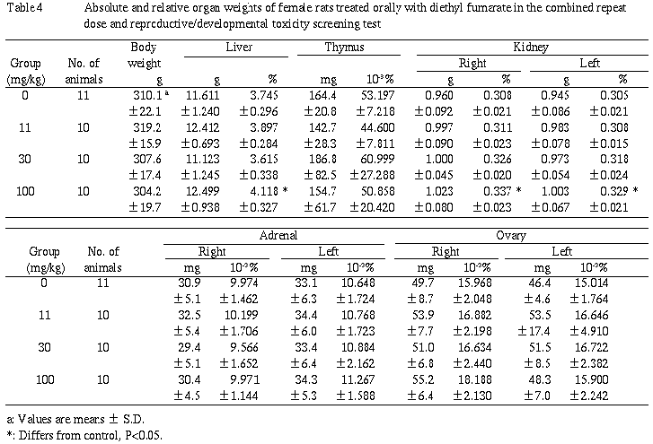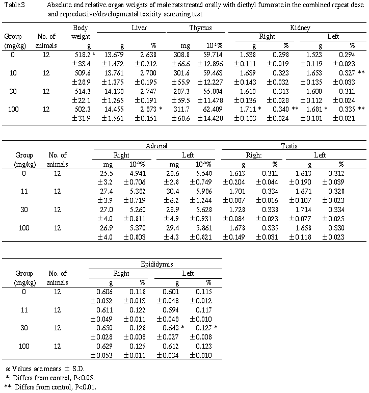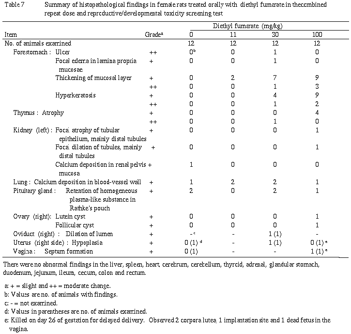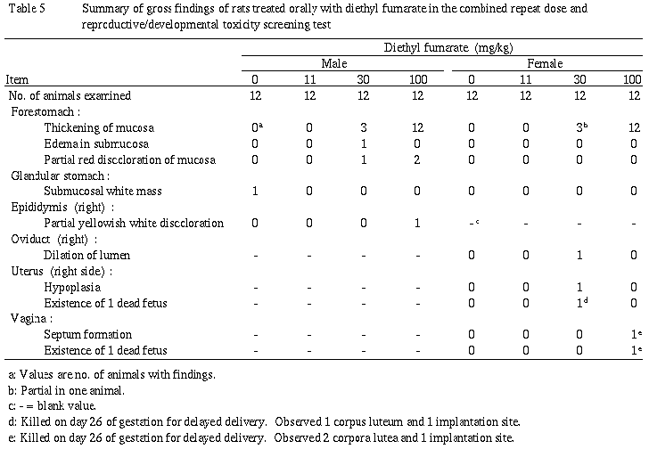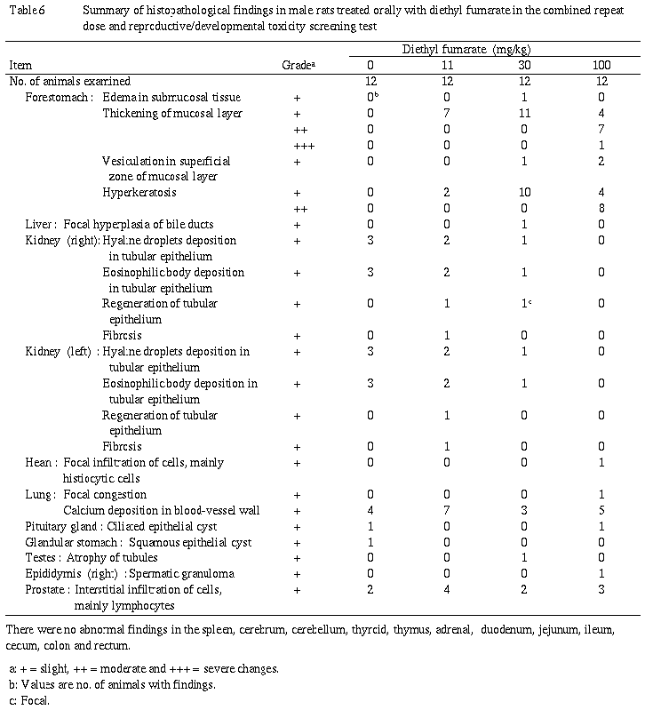 以上より,11mg/kg群の雌雄でも前胃に被験物質の刺激による変化が認められたことから,本スクリーニング試験におけるフマル酸ジエチル反復投与による無影響量(NOEL)は雌雄ともに11mg/kg/day(投与可能最小量)未満であることが示唆された.