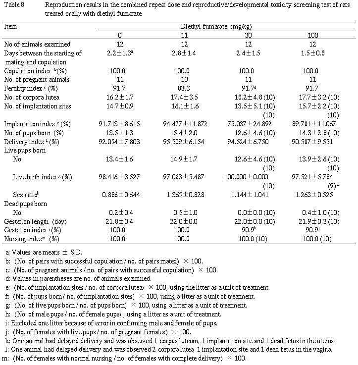 以上より,生殖・発生について被験物質投与による影響は認められないことから,本スクリーニング試験におけるフマル酸ジエチルの雌雄動物の生殖および次世代の発生に対する無影響量は100mg/kg/dayであることが示唆された.