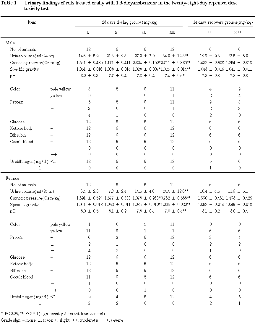 尿検査では, 40および200 mg/kg群の雌雄で尿量の増加ならびに浸透圧および比重の減少が認められ,200 mg/kg群の雌雄ではpHの減少も認められた.