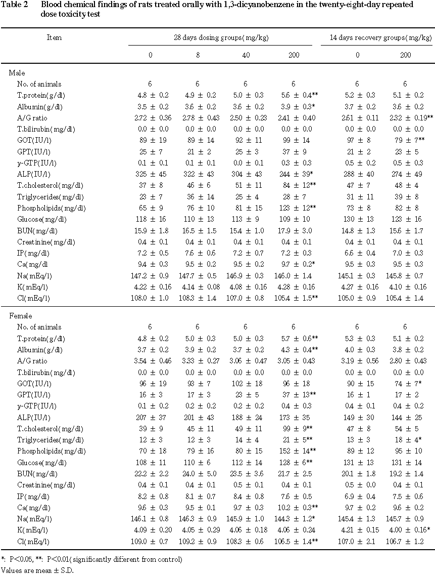 今回, OECD既存化学物質安全性点検に係わる毒性試験の一環として,1,3-ジシアノベンゼンの0(対照),8,40および200 mg/kg/dayを1群雌雄各6匹のCrj:CD(SD系)ラットに28日間反復経口投与する毒性試験を実施し,以下の結果を得た.なお,対照群および200 mg/kg群にはそれぞれ雌雄各6匹の14日間回復群も設けた.