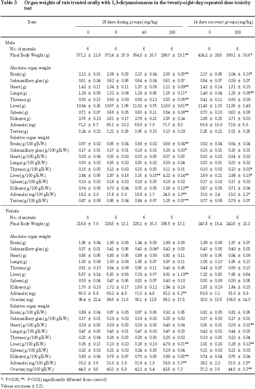 回復期間終了時の検査では,投与期間終了時と同様に 200 mg/kg群の雌雄で肝臓および副腎の相対重量に増加が認められたが,絶対重量には有意な増加はみられず,その程度は投与期間終了時と比較して軽減した.そのほか,200 mg/kg群の雄で脳および肺の絶対重量の減少ならびに胸腺の相対重量の増加,同群の雌で心臓および卵巣の相対重量の増加が認められた.