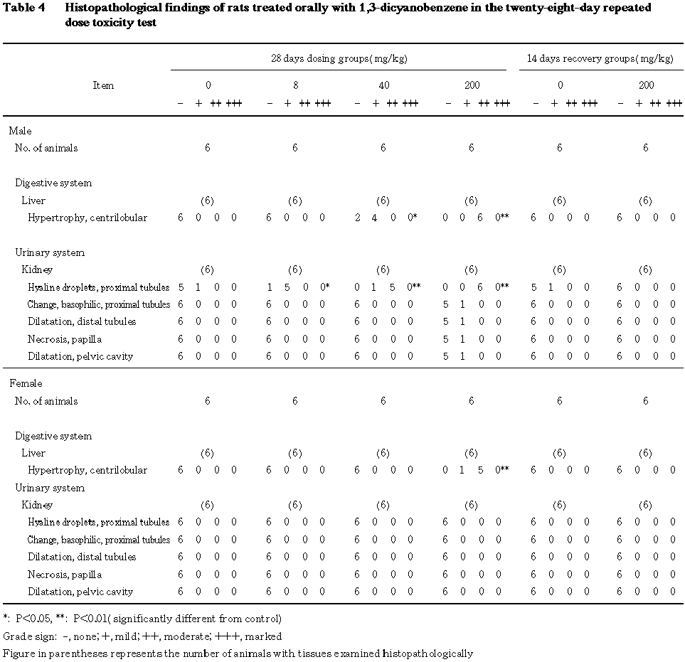 病理組織学検査では,肝臓において,肝細胞の肥大が 40 mg/kg群の雄の多数例および200 mg/kg群の雌雄全例に認められた.また,腎臓において,近位尿細管上皮の硝子滴の出現頻度が雄ではすべての被験物質投与群で対照群より高く,200 mg/kg群の雄1例では乳頭壊死,腎盂拡張,近位尿細管上皮の好塩基性変化および遠位尿細管の拡張が認められた.