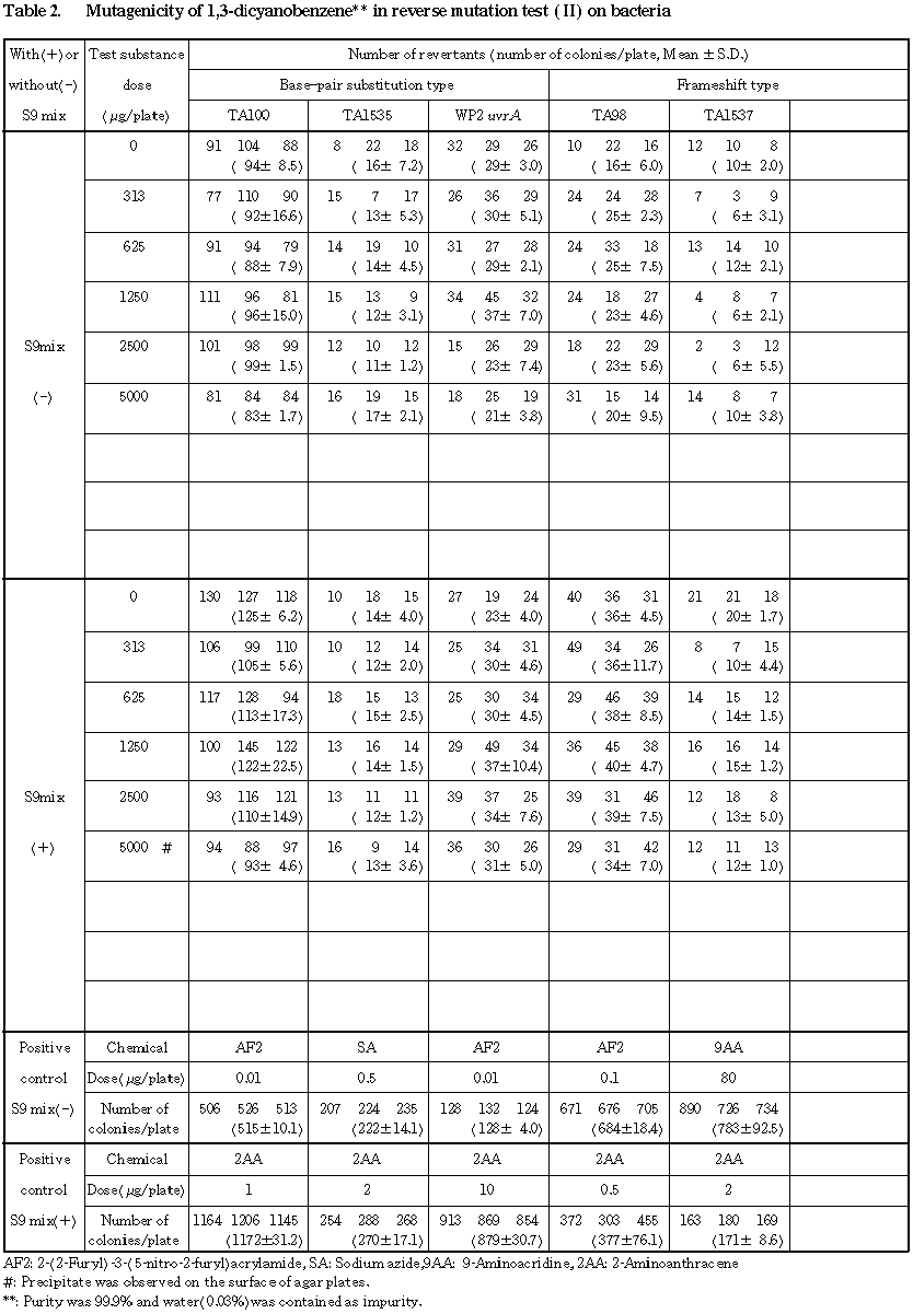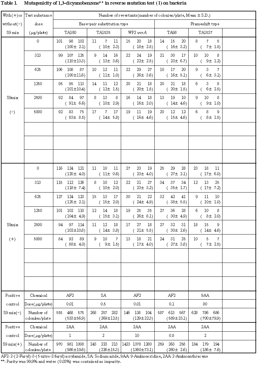 ¸¡Äê¶Ý¤È¤·¤Æ¡¤ Salmonella typhimurium TA100, TA1535, TA98, TA1537¤ª¤è¤ÓEscherichia coli WP2 uvrA¤Î5¶Ý³ô¤òÍѤ¤¡¤S9 mix̵ź²Ã¤ª¤è¤Óź²Ã¤Î¾ò·ï¤Ç¥×¥ì¡¼¥ÈË¡¤Ë¤è¤ê¡¤ÍÑÎÌÀßÄê»î¸³¤ò50¡Á5000 ¦Ìg/¥×¥ì¡¼¥È¤ÎÍÑÎ̤ǹԤ俤Ȥ³¤í¡¤¤¹¤Ù¤Æ¤Î¸¡Äê¶Ý¤Ë¤ª¤¤¤Æ S9 mix ̵ź²Ã»î¸³¤ª¤è¤Óź²Ã»î¸³¤Î¤¤¤º¤ì¤â¹³¶ÝÀ¤Ïǧ¤á¤é¤ì¤Ê¤«¤Ã¤¿¡¥¤·¤¿¤¬¤Ã¤Æ¡¤Ëܻ¤Ç¤ÏS9 mix̵ź²Ã»î¸³¤ª¤è¤Óź²Ã»î¸³¤ò313¡Á5000 ¦Ìg/¥×¥ì¡¼¥È¤ÎÈÏ °Ï¤ÇÍÑÎ̤òÀßÄꤷ¤Æ¼Â»Ü¤·¤¿¡¥
