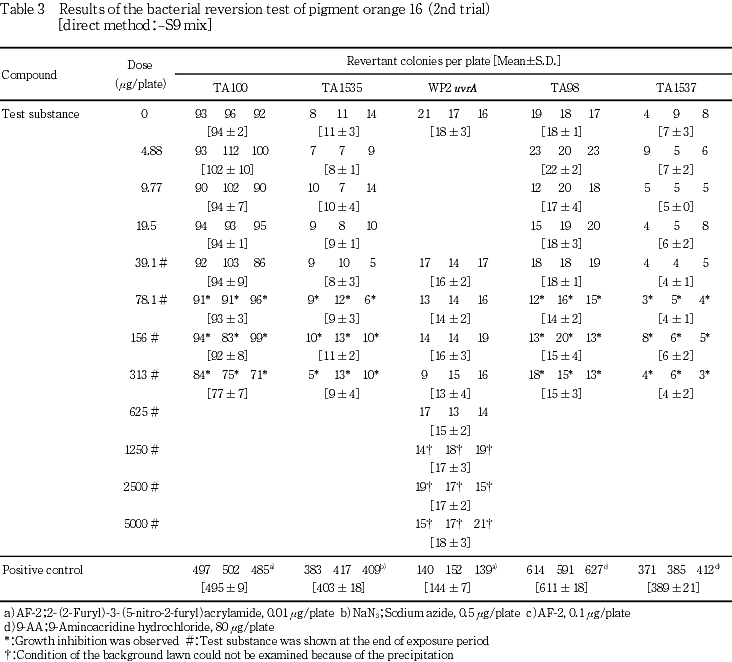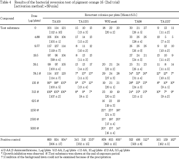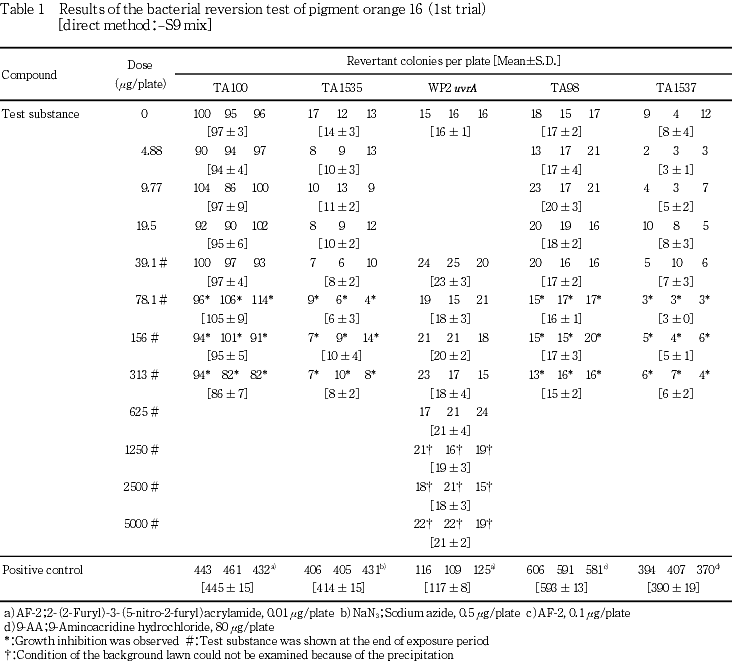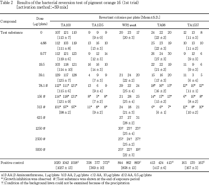 以上の試験結果から,本試験条件下において,ピグメントオレンジ16の微生物に対する遺伝子突然変異に関し,陰性と判定した.