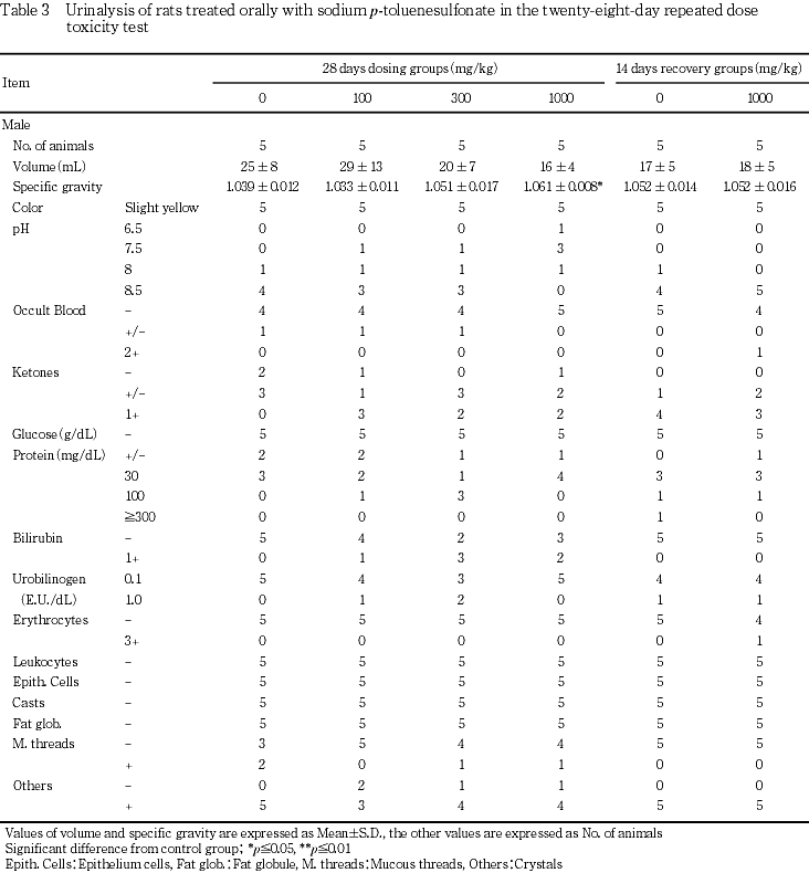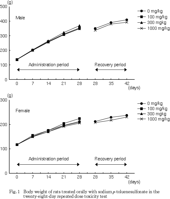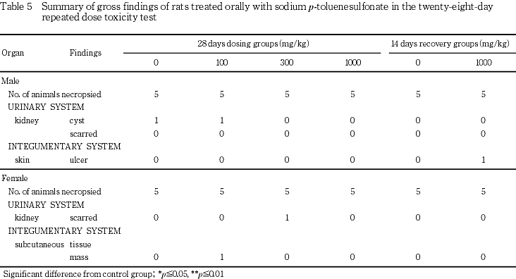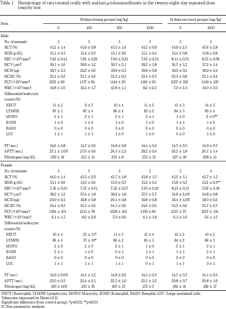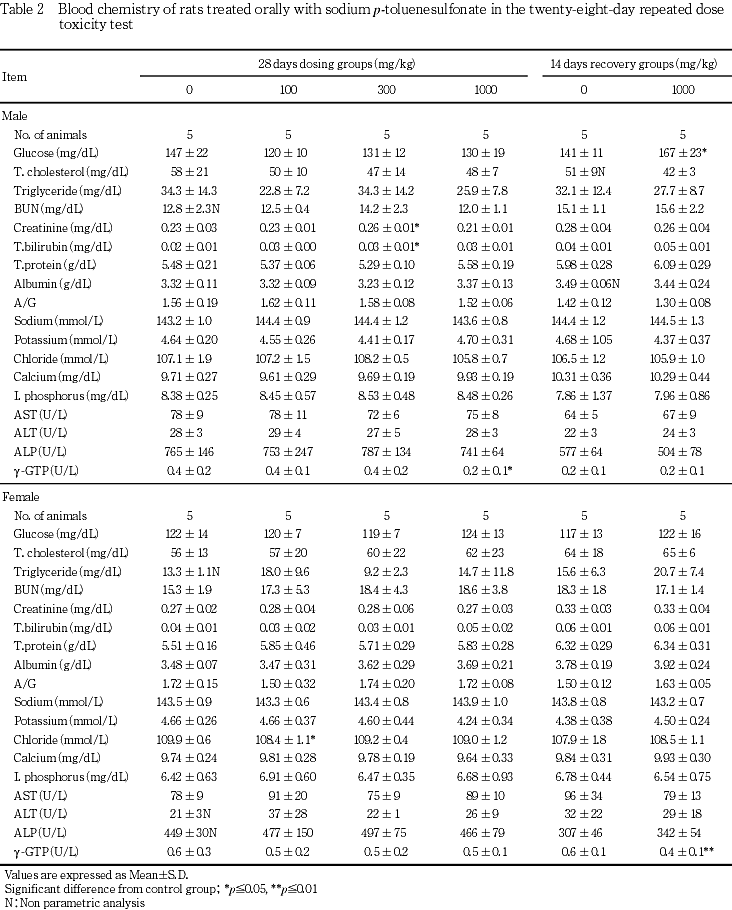 ρ-トルエンスルホン酸ナトリウムを0(対照群),100,300および1000 mg/kgの用量でCD(SD)IGS[SPF]系雌雄ラットに28日間強制経口投与し,その毒性を検討した.対照群および1000 mg/kg群については,別に14日間の回復群を設けた.