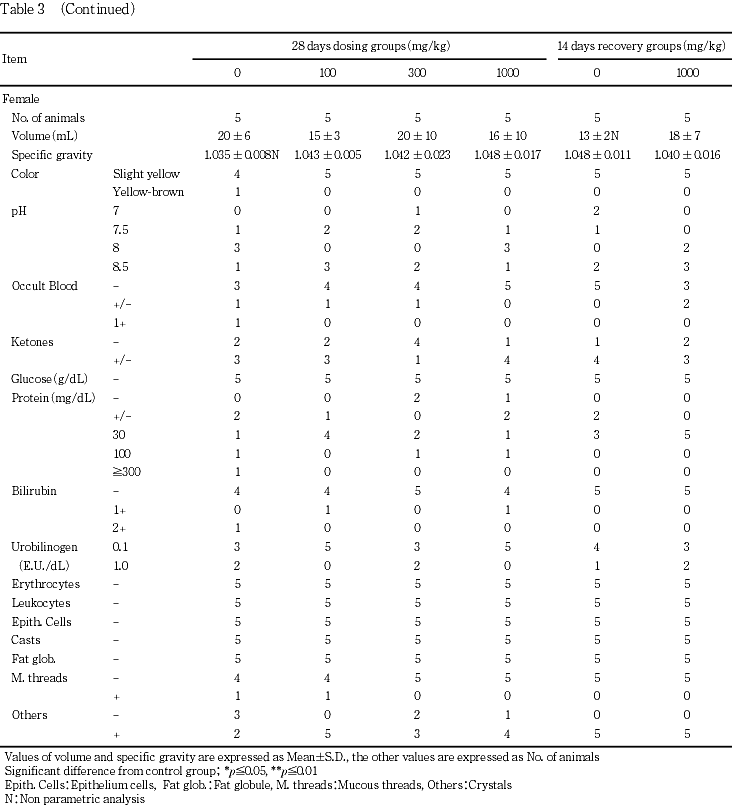 尿検査の結果,雄の1000 mg/kg群で尿比重の高値が認められたが,他に関連する変化は認められず,毒性的意義はないものと判断された.