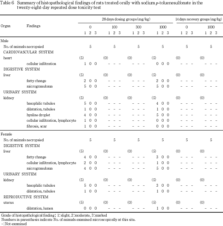 以上の結果から,本試験におけるρ-トルエンスルホン酸ナトリウムの無影響量は雌雄ともに被験物質に起因する変化が認められなかった1000 mg/kg/dayと判断された.