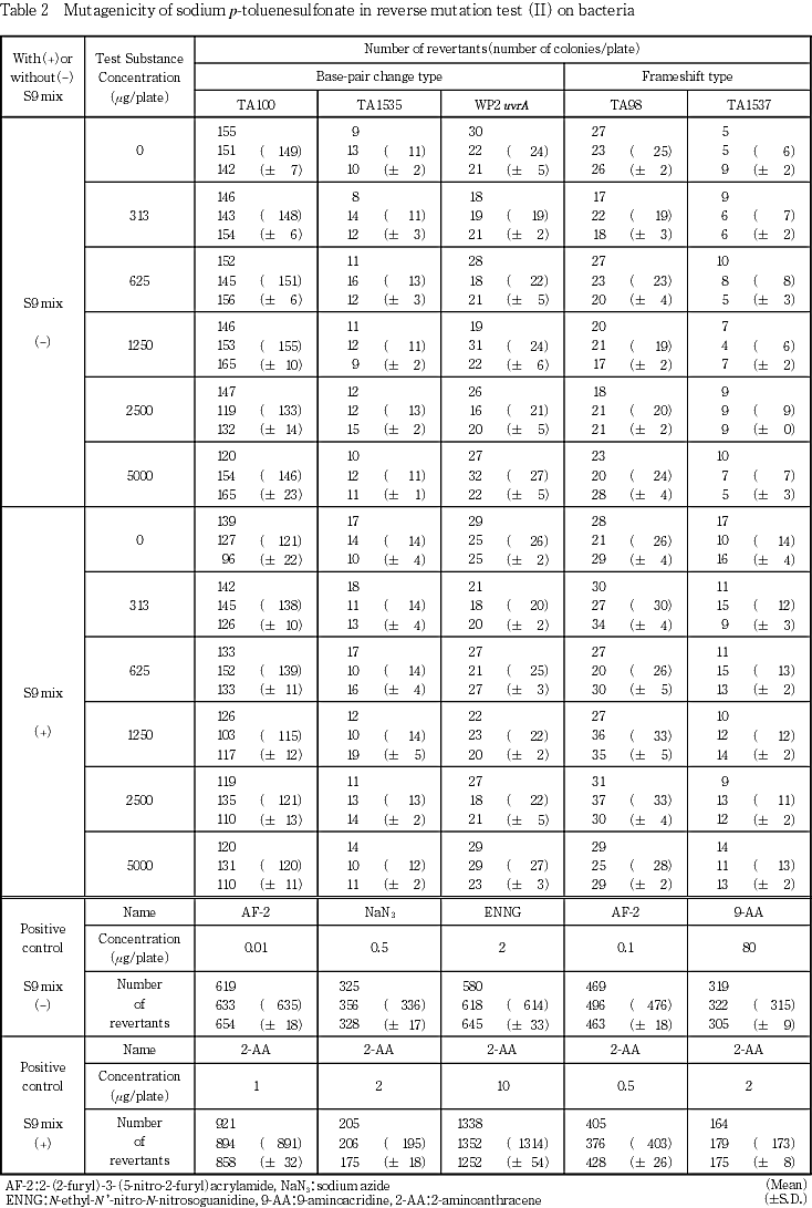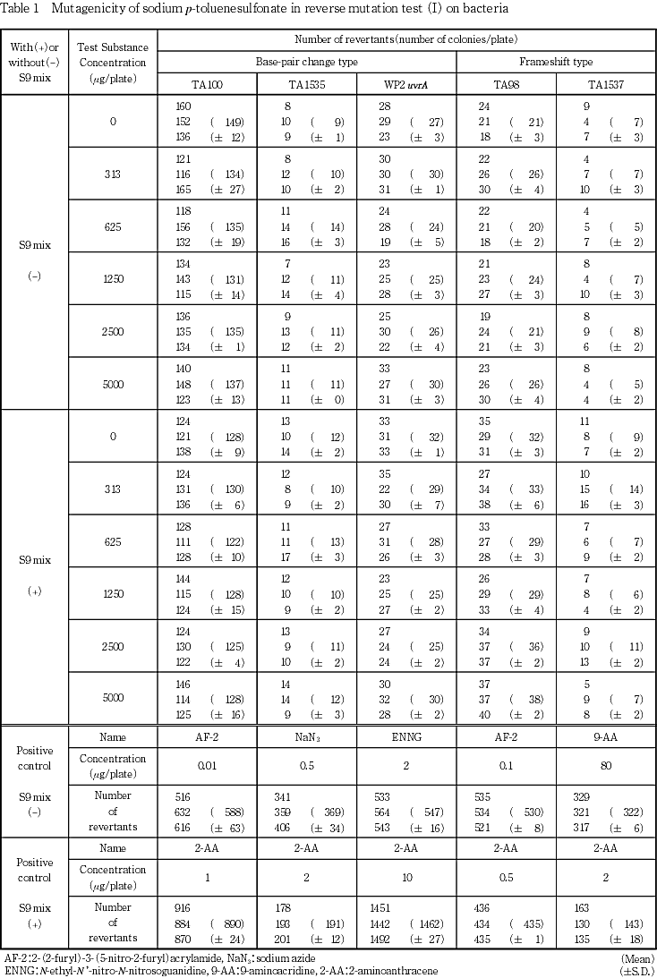 以上の結果から,ρ-トルエンスルホン酸ナトリウムは本試験系において変異原性を有さない(陰性)と判定した.