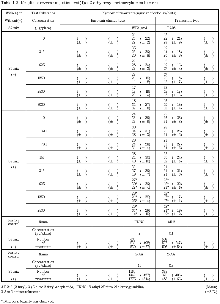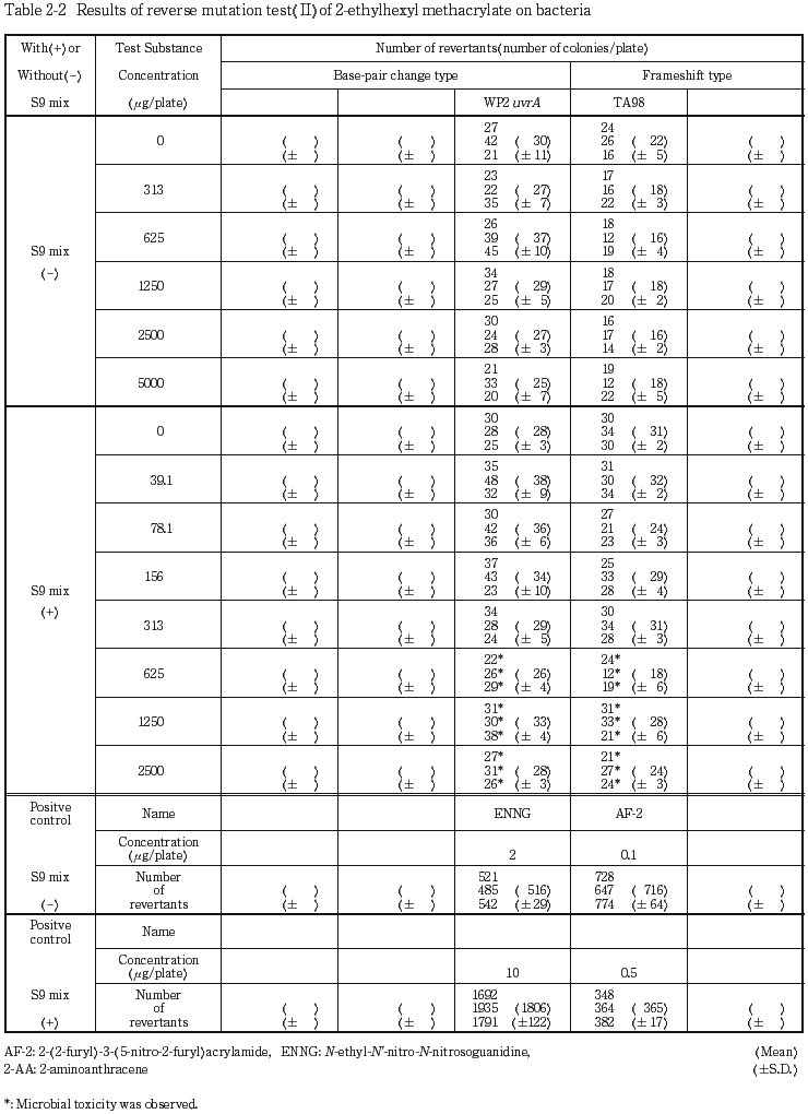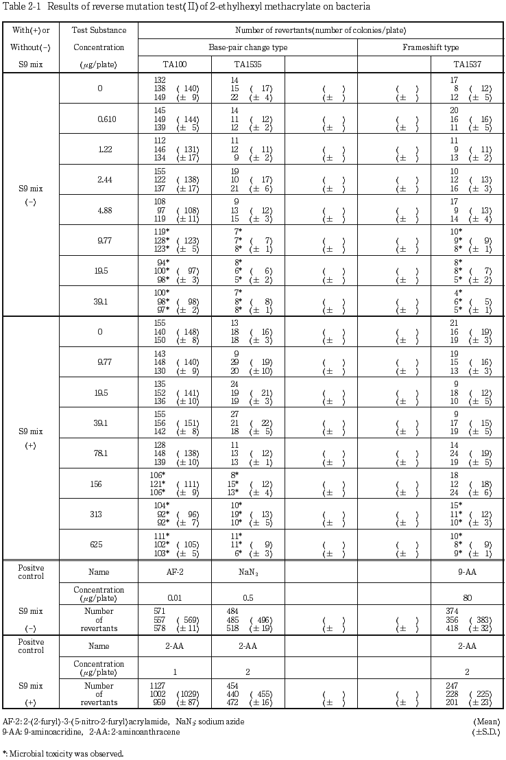 以上の結果から, 2-エチルヘキシルメタクリラートの変異原性は陰性と結論した.