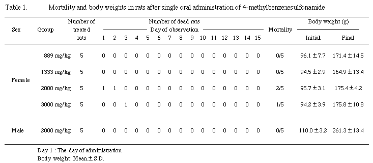 その結果、雌では、2000 mg/kg投与群の5例中2例と3000 mg/kg投与群の5例中1例が投与当日から3日目にかけて死亡したが、雄では2000 mg/kgを投与しても死亡例は認められなかった。従って、4−メチルベンゼンスルホンアミドのラットにおける経口投与によるLD50値は、雌雄とも2000 mg/kgを上回る量と推定された。投与後の一般状態の変化としては、活動性の低下、触発反応の低下、よろめき歩行などの歩行異常、腹臥位あるいは横臥位姿勢および赤色尿の排泄などが認められ、2000 mg/kg投与群で雌雄の一般状態の変化を比較すると、雄より雌の方が被験物質投与による影響が顕著であり、また、雌では、上述の一般状態の変化に用量依存性が認められた。死亡例の体重は、投与直前と比較していずれも減少していた。生存例では、雌雄とも2000 mg/kg以上の一部の例で2日目に一過性の体重減少がみられた以外、体重は観察終了時まで順調に増加した。病理学的検査では、死亡例において、膀胱あるいは尿道の出血や上皮の剥離または欠損、腎臓の尿細管上皮細胞の水腫性腫脹、尿細管上皮細胞の細胞質内にPAS反応陽性好酸性微細顆粒の出現あるいは肺水腫などがみられた。生存例については、15日目に屠殺剖検を行った結果、雌雄いずれの投与群においても、主要な器官・組織に肉眼的変化は認められなかった。