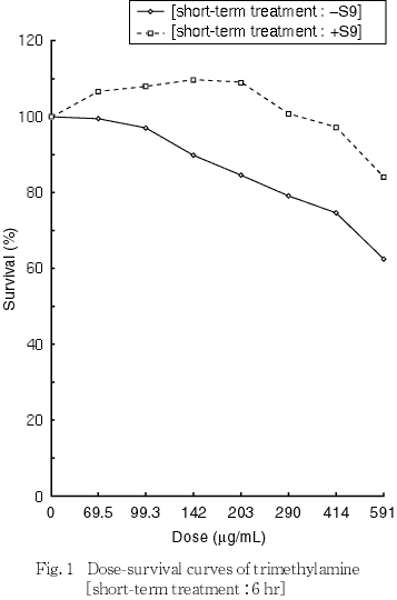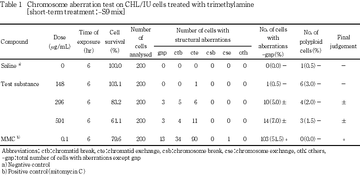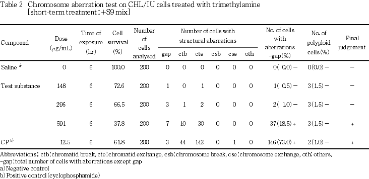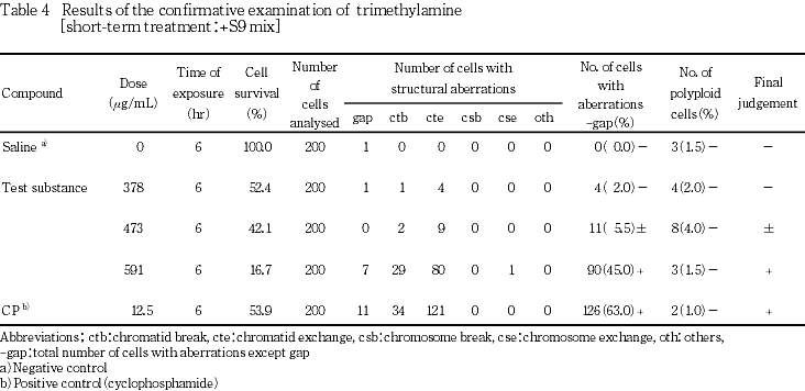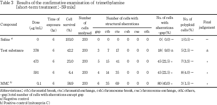 以上の結果より,本試験条件下ではトリメチルアミンは,染色体異常を誘発する(陽性)と結論した.