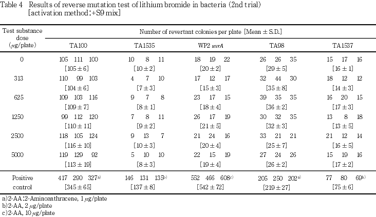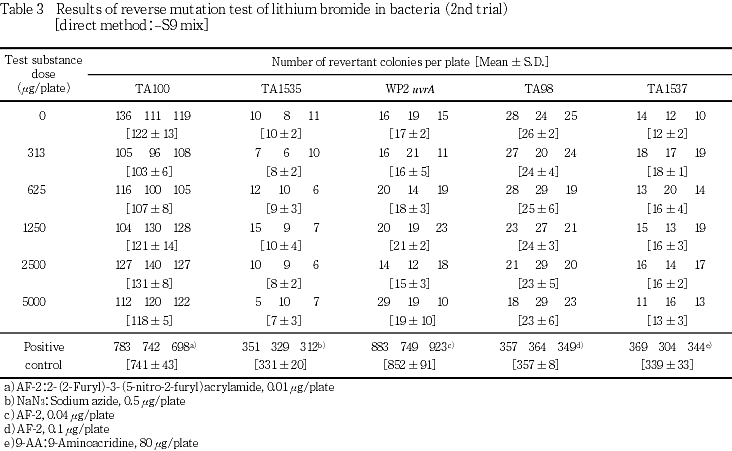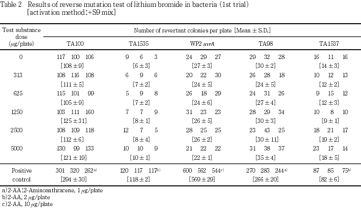 以上の成績から,臭化リチウムの細菌に対する遺伝子突然変異誘発性は陰性と判定した.