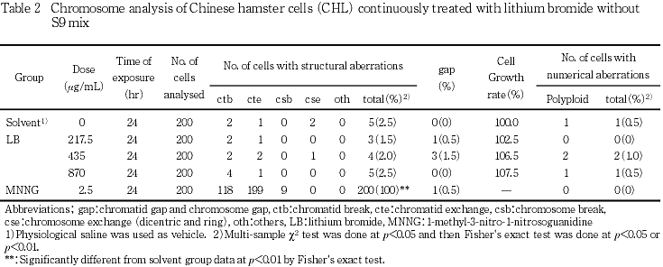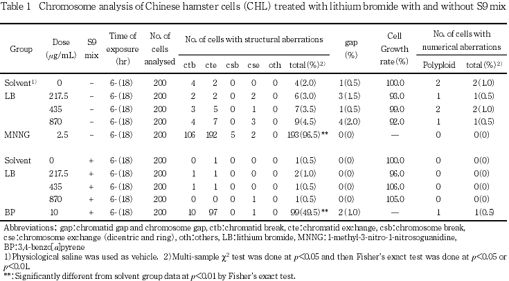 したがって,臭化リチウムのCHL/IU細胞に対する染色体異常誘発性は陰性と判定した.本試験結果は,CHL/IU細胞において,染色体異常を有する細胞の出現頻度が5 %未満を陰性とする石館らの判定基準2)からみても,明らかに陰性と判断されるものであった.