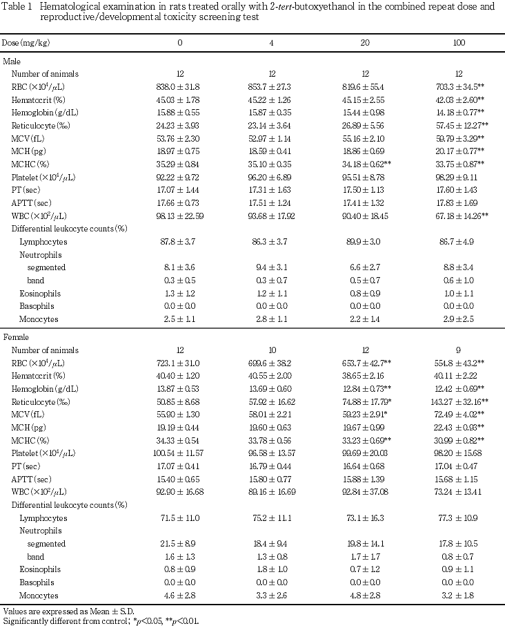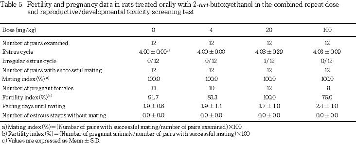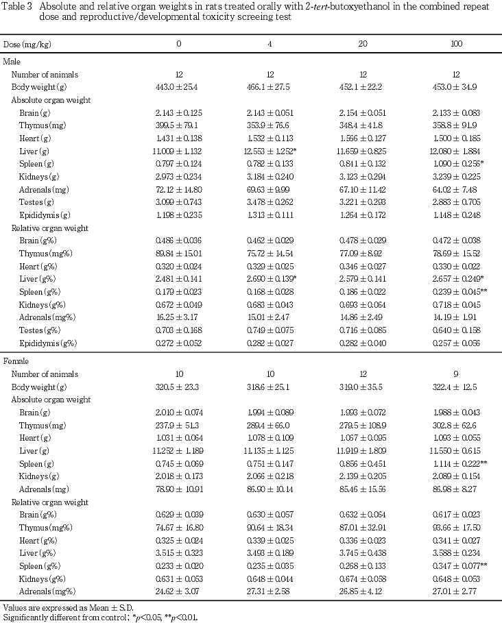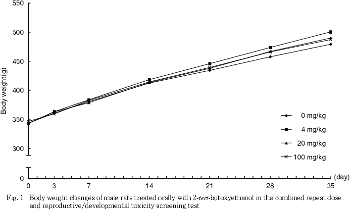 2-tert-ブトキシエタノールのtert-ブトキシは,ブチルアルコールから誘導される1価の原子団C4H9O-が4種の異性構造を有する中の1つである1).この異性構造のうちn-ブトキシを有する2-n-ブトキシエタノールは塗料・印刷インク・染料・農薬などの溶剤,工業用洗剤・ドライクリーニング,可塑剤,浸透剤,軟化剤,農薬の原料などに使われ2),その毒性も詳細に検討されている3, 4).しかし,2-tert-ブトキシエタノールの毒性情報としては,ラットの経口投与による単回投与毒性試験でLD50値が雌雄ともに2000 mg/kg以上との報告5)があるにすぎず,反復投与および生殖発生毒性についての知見はない.今回,OECDによる既存化学物質の安全性点検に係わる毒性調査事業の一環として,2-tert-ブトキシエタノールを4,20および100 mg/kg/dayの用量でSD系ラット(1群雌雄各12匹)に交配前14日から交配を経て雄は計37日間,雌は妊娠,分娩を経て哺育4日まで経口投与し,反復投与毒性および生殖発生毒性について検討した.