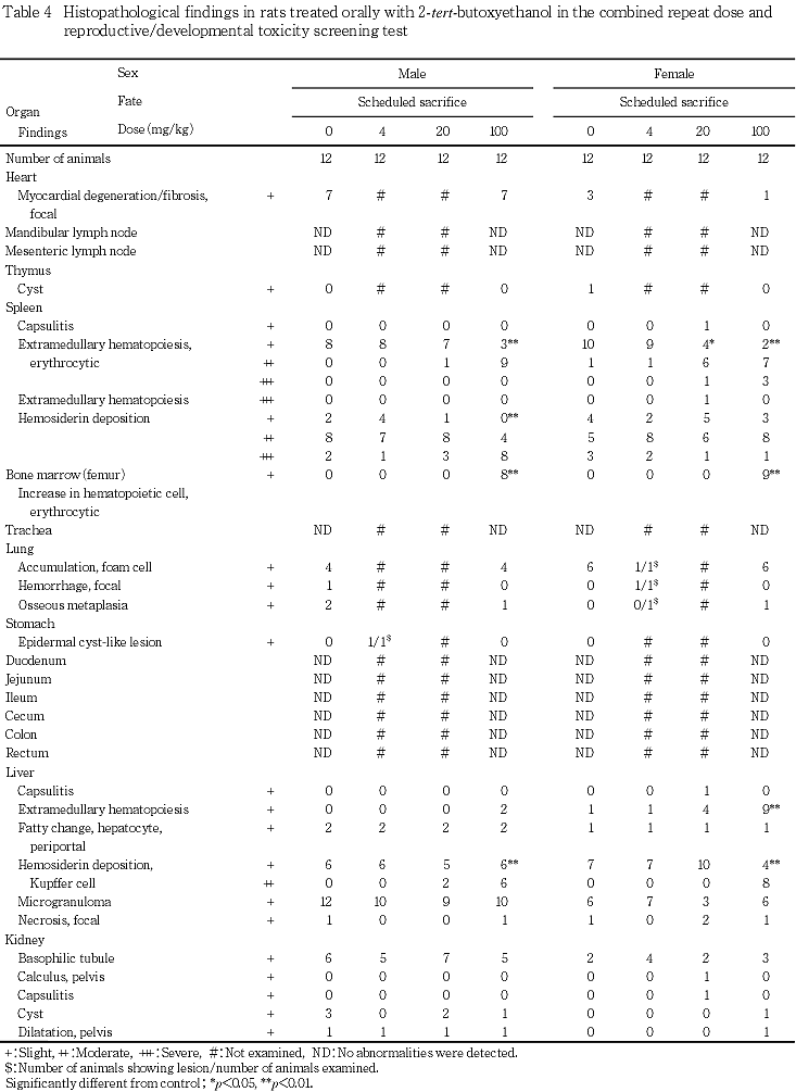 肝臓における髄外造血の発現例数の有意な増加が100 mg/kg群の雌にみられた.雌では髄外造血が対照群と4 mg/kg群の各1例および20 mg/kg群の4例においても認められた.20 mg/kg群の4例のうち1例は脾臓の重度の髄外造血と腎臓の尿細管上皮細胞のヘモジデリン沈着がみられた個体であり,被験物質投与による影響と判断した.また,雄の髄外造血は100 mg/kg群の2例だけであったが,対照群,4および20 mg/kg群ではみられなかった所見であり,被験物質投与による影響と判断した.肝臓におけるクッパー細胞のヘモジデリン沈着の増強が20 mg/kg以上の群の雄,および100 mg/kg群の雌で認められた.