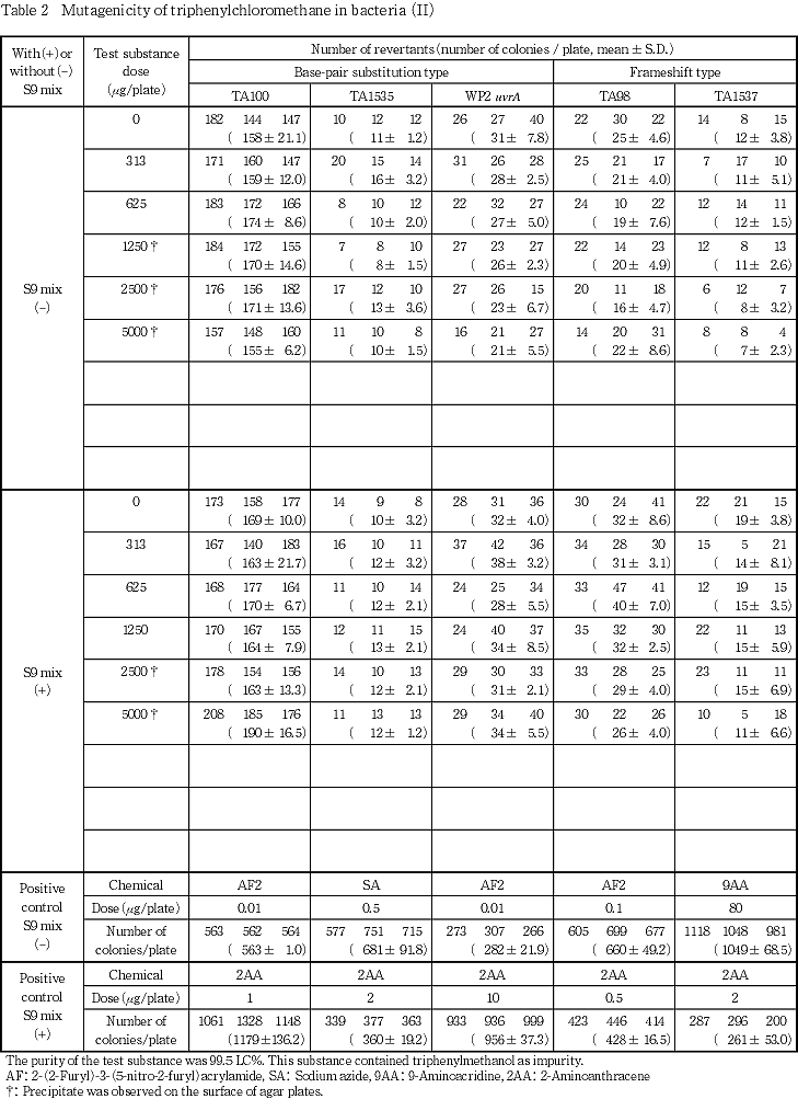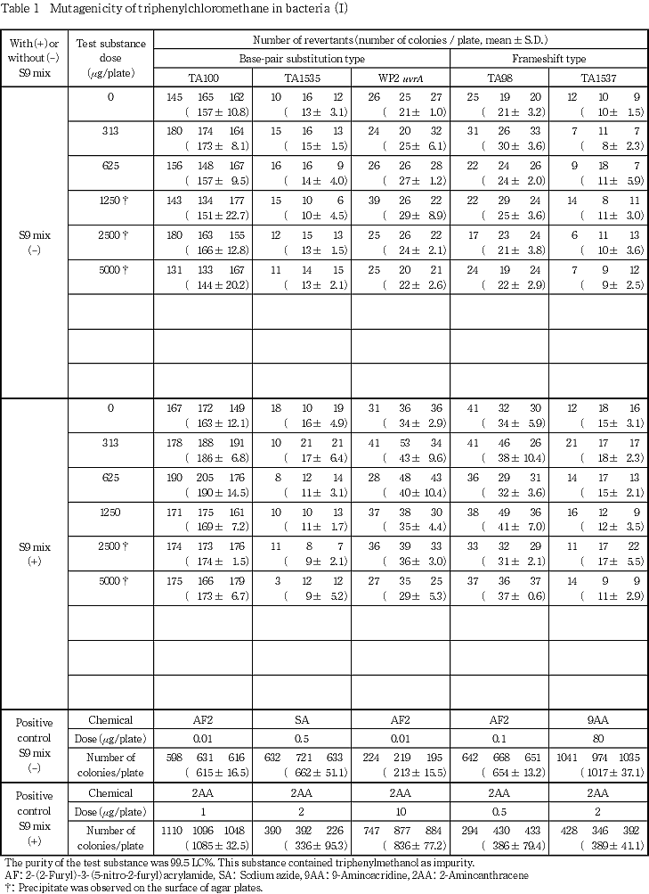 以上の結果からトリフェニルクロロメタンは,用いた試験系において変異原性を有しないもの(陰性)と判定した.