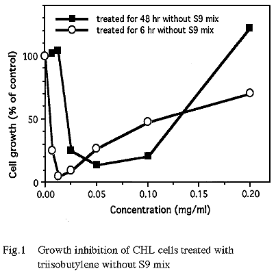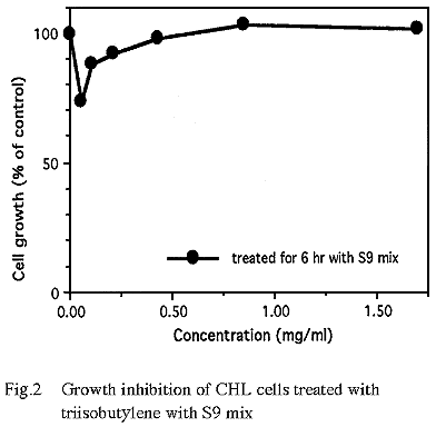 その結果,トリイソブチレン の約50% の増殖抑制を示す濃度を,50%をはさむ2濃度の値より算出したところ, 直接法では 0.021 mg/ml となった.一方,代謝活性化法のS9mix 非存在下では0.0042 mg/ml となった.また,S9mix 存在下では1.70 mg/ml(10 mM)の濃度においても50%を越える増殖抑制作用は認められなかった (Fig. 1,2).