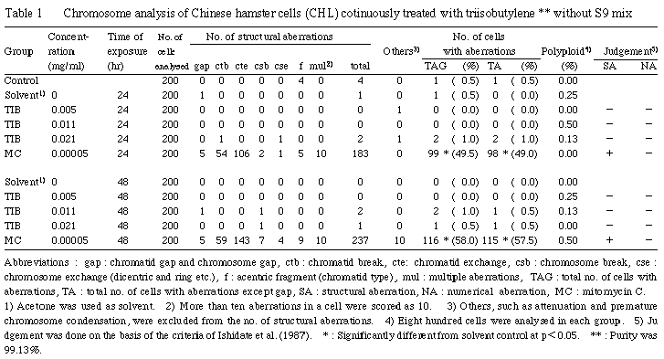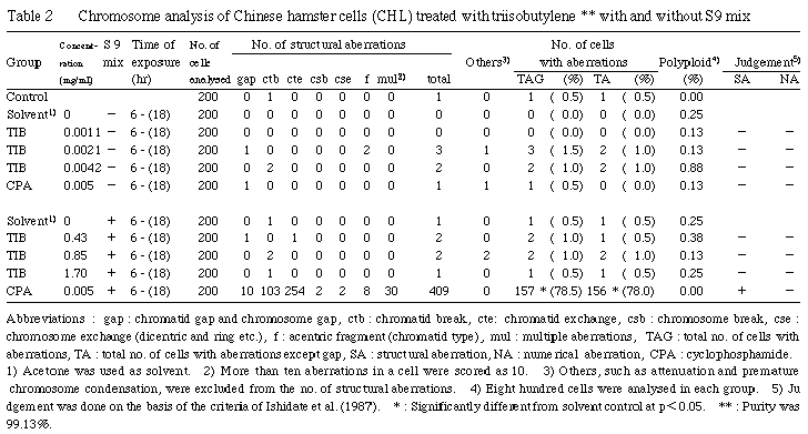 以上の結果からトリイソブチレンは,上記の試験条件下で試験管内のCHL細胞に染色体異常を誘発しないと結論した.
