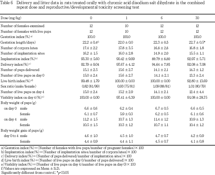 以上のように,二クロム酸ナトリウム二水和物の反復経口投与による一般毒性学的影響として,病理組織学的に胃の変化が6および30 mg/kg群の雌雄,腎臓の変化が30 mg/kg群の雌,流涎および軽度な貧血が30 mg/kg群の雌雄で認められた.また,生殖発生毒性に及ぼす影響として,妊娠期間の延長が30 mg/kg群でみられただけで,生殖機能,分娩・哺育機能,さらに次世代の発育への影響は認めらなかった.したがって,本試験条件下における反復投与毒性に関する無影響量は雌雄とも1 mg/kg/day,生殖発生毒性に関する無影響量は雄親動物で30 mg/kg/day,雌親動物で6 mg/kg/day,児動物で30 mg/kg/dayと考えられる.