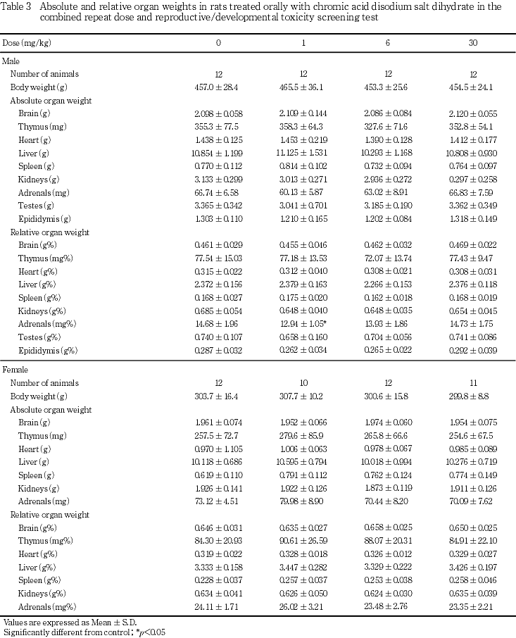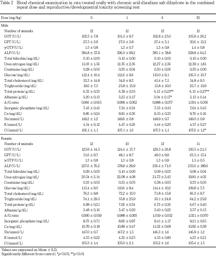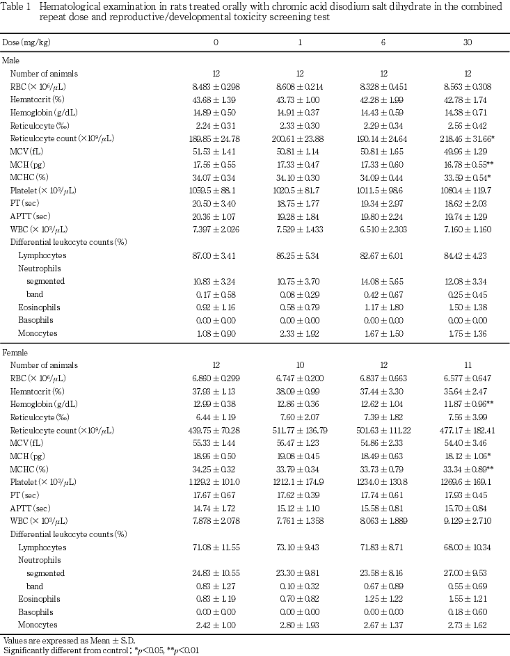 二クロム酸ナトリウム二水和物の毒性情報として,経口投与によるラットのLD50値が雄で252.4 mg/kg,雌で181.0 mg/kgとの報告がある1).しかし,反復投与および生殖発生毒性についての知見はない.二クロム酸ナトリウム二水和物を1,6および30 mg/kg/dayの用量でSD系ラット(1群雌雄各12匹)に交配前14日から交配を経て雄は計37日間,雌は妊娠,分娩を経て哺育4日まで経口投与し,反復投与毒性および生殖発生毒性について検討した.