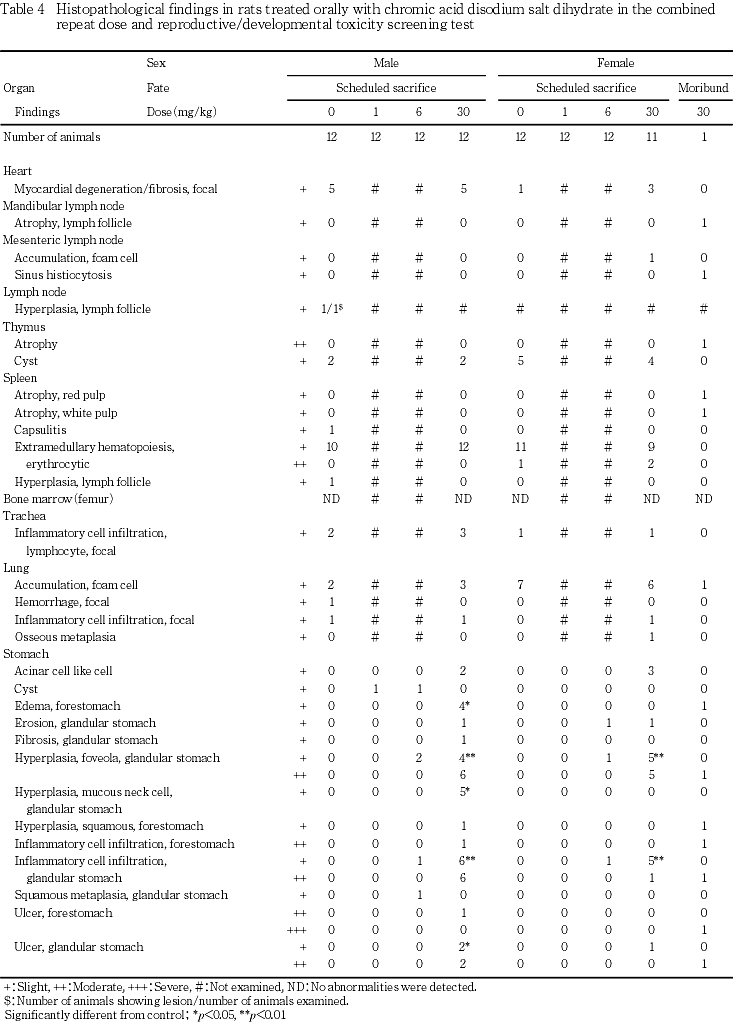 上述した被験物質に起因する変化に随伴して腺胃粘膜の膵腺房細胞様細胞が30 mg/kg群の雄2例および雌3例,腺胃粘膜の線維化が30 mg/kg群の雄1例,前胃の水腫が30 mg/kg群の雄4例および前胃粘膜扁平上皮の増生が30 mg/kg群の雄1例に認められた.
