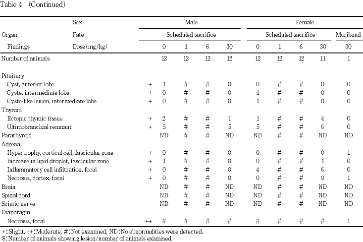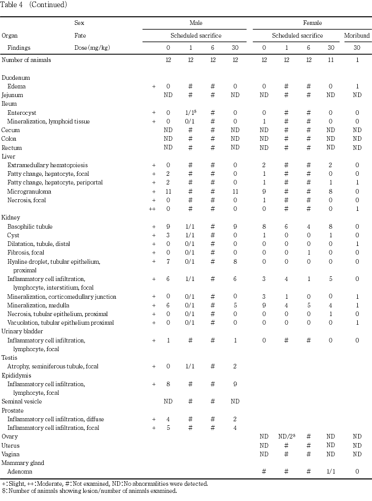 その他,皮下の腫瘤が30 mg/kg群の雌1例に認められた.この他にもいくつかの肉眼的変化が対照群を含む各群で認められたが,被験物質投与群で多発するものはなく,いずれも偶発的変化と判断した.なお,肉眼的に腺胃粘膜の白色斑がみられた1 mg/kg群の雌1例では対応する組織変化は認められなかった.