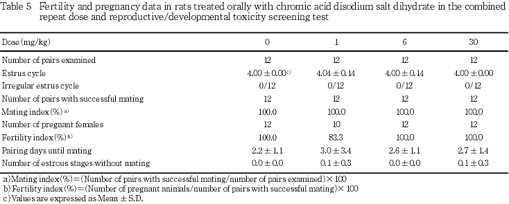 以上の結果から,二クロム酸ナトリウム二水和物の反復投与毒性に関する無影響量は雌雄とも1 mg/kg/day,生殖発生毒性に関する無影響量は雄親動物で30 mg/kg/day,雌親動物で6 mg/kg/day,児動物で30 mg/kg/dayと考えられる.