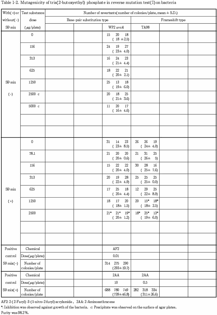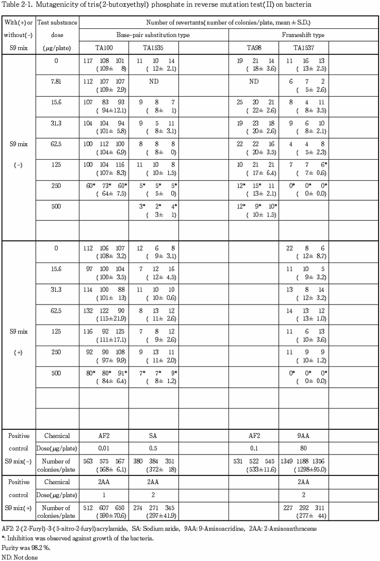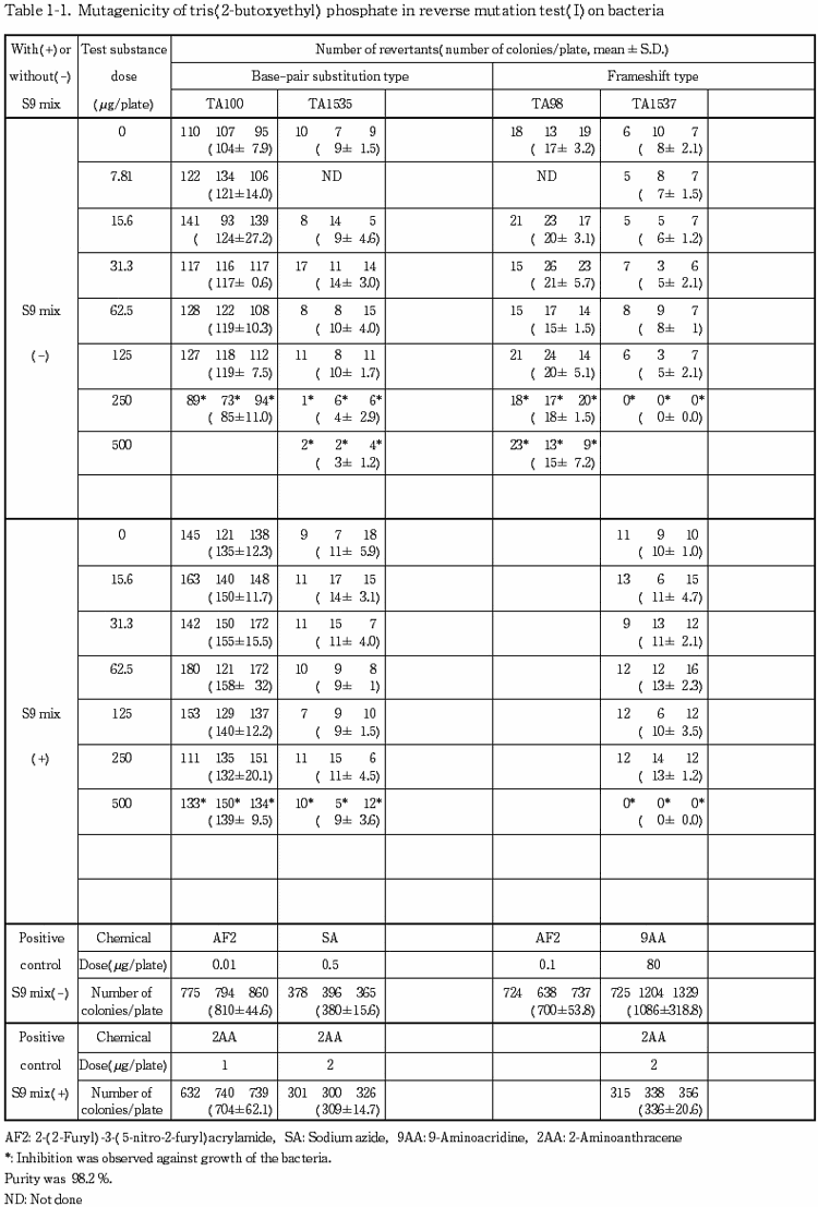 以上の結果に基づき,リン酸トリス(2-ブトキシエチル)エステルは,用いた試験系において変異原性を有しない(陰性)と判定した.