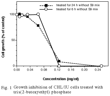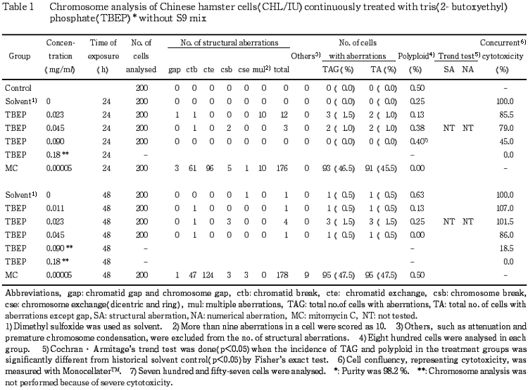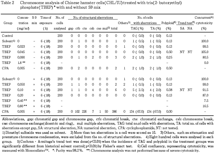 従って,リン酸トリス(2-ブトキシエチル)エステルは,上記の試験条件下で,試験管内の CHL/IU 細胞に染色体異常を誘発しないと結論した.