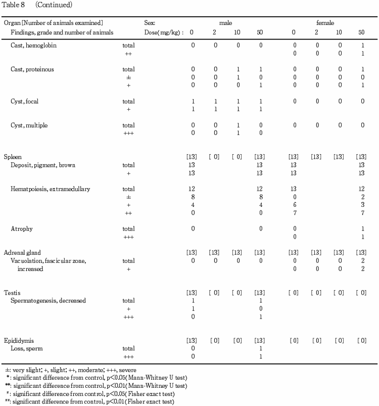 ¤½¤Î·ë²Ì¡¤Íº¤Ç¤Ï 10 mg/kg °Ê¾å¤ÎÅêÍ¿¤Ë¤è¤ê¡¤ÅêÍ¿¸å¤Ë°ì²áÀ¤Îή޷¤òͶȯ¤µ¤»¡¤50mg/kg ÅêÍ¿¤Ç¤Ï¡¤ÅêÍ¿´ü´Ö½é´ü¤ËÂνÅÁý²Ã¤ª¤è¤ÓÀݱÂÎ̤òÍÞÀ©¤·¤¿¡¥42²óÈ¿ÉüÅêÍ¿¸å¤Î˶¸¡¤Ç¤Ï¡¤2 mg/kg °Ê¾å¤Î·²¤Ç¿Õ¡½ÅÎ̤¬Áý²Ã¤·¡¤10 mg/kg °Ê¾å¤Î·²¤Ç¤Ï´Î¡½ÅÎ̤¬Áý²Ã¤·¤¿¡¥ÉÂÍýÁÈ¿¥¸¡ºº¤Ç¤Ï¡¤2 mg/kg °Ê¾å¤Î·²¤Ç¿Õ¡¤Î eosinophilic body ¤ª¤è¤Ó¹¥±ö´ðÀÇ¢ºÙ´É¤¬Áý²Ã¤·¡¤ðùγ¾õ±ßÃ줬¤ß¤é¤ì¤¿¡¥¤Þ¤¿¡¤10 mg/kg °Ê¾å¤Î·²¤Ç¤Ï¡¤¾®ÍÕÃæ¿´À¤Î´ÎºÙ˦ÈîÂ礬´Ñ»¡¤µ¤ì¤¿¡¥Ë¶¸¡»þ¤Î·ì±Õ¸¡ºº¤Ç¤Ï¡¤50 mg/kg ÅêÍ¿¤Ë¤è¤ê·ì¾®ÈĤª¤è¤ÓÇò·ìµå¿ô¤ÎÁý²Ã¤¬¤ß¤é¤ì¡¤·ì±ÕÀ¸²½³Ø¸¡ºº¤Ç¤â¡¤50 mg/kg ÅêÍ¿¤Ë¤è¤êÁíÃÁÇò¡¤¥¢¥ë¥Ö¥ß¥ó¡¤Áí¥³¥ì¥¹¥Æ¥í¡¼¥ë¡¤¥«¥ë¥·¥¦¥à¤ª¤è¤Ó̵µ¡¥ê¥ó¤Î³ÆÇ»ÅÙ¤ÎÁý²Ã¡¤A¡¿GÈæ¤ª¤è¤Ó±öÁÇÇ»ÅÙ¤ÎÄã²¼¤¬Ç§¤á¤é¤ì¤¿¡¥