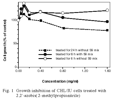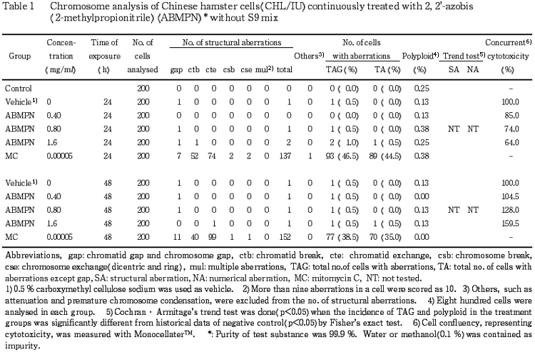 従って,2,2'-アゾビス(2-メチルプロパンニトリル)は,上記の試験条件下で,試験管内の CHL/IU 細胞に染色体異常を誘発しないと結論した.