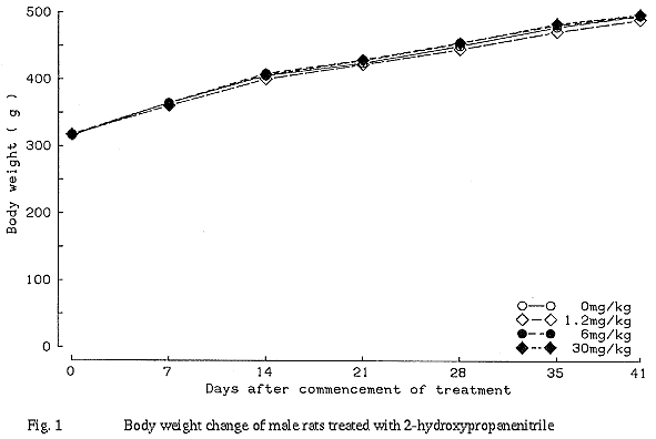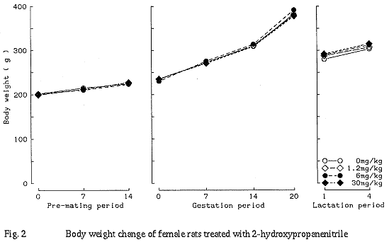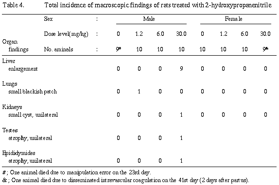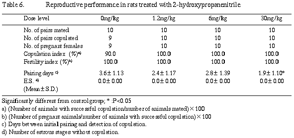 以上の結果より、本試験条件下における2−ヒドロキシプロパンニトリルの反復投与毒性に関する無影響量は雌雄とも6mg/kg、生殖・発生毒性に関する無影響量は親動物の雌雄および児動物ともに30mg/kgと考えられる。